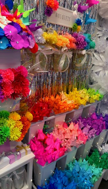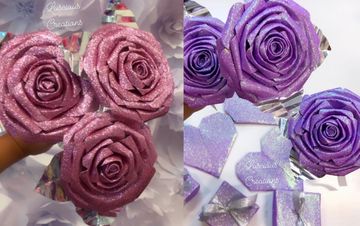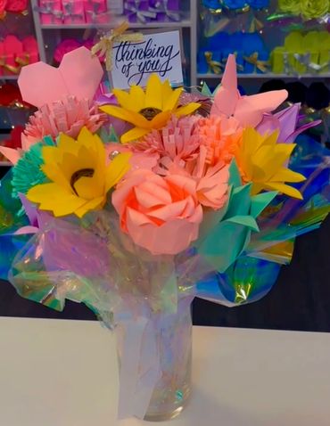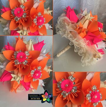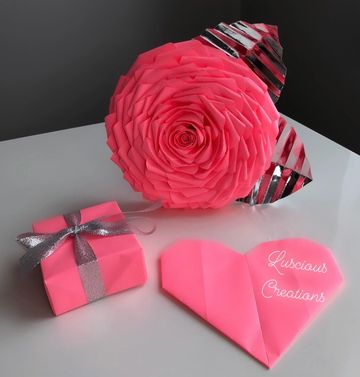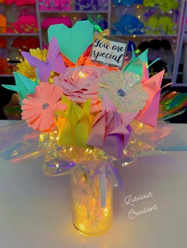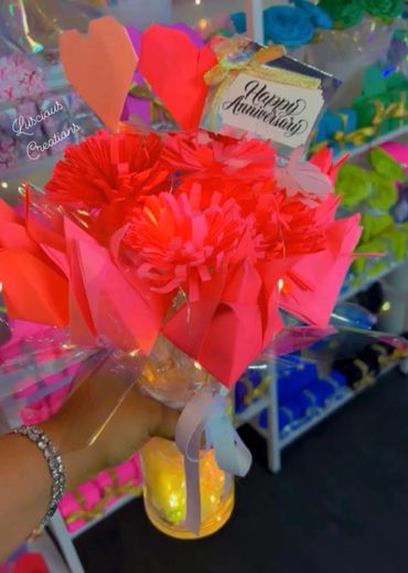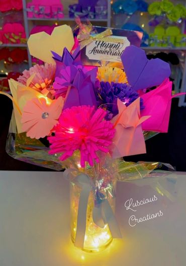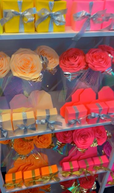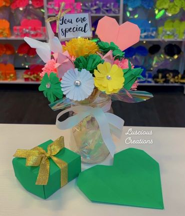 Hand sculped bouquets are made using origami technique. Choose up to 5 different colors. Pick the color wrapping and ribbon color. You also get to select from 8-10 options for a center piece gem. You can give these gorgeous bouquets to anyone. Comes with matching box & love heart. Make someone feel special today.