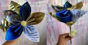 Hand sculled flower made using origami techniques. Choose up to 3 different photos and 2 colors colors. You also get to select from 8-10 options for a center piece gem. Choose gold or silver leaves. You can give these gorgeous flowers to anyone. Comes with matching box & love heart. Make someone feel special today.