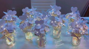 Now you can have your own little creation in a jar. You can choose up to 5 little flowers. Add a butterfly and heart inside. If you want your jar stuffed double the size just add $10 more. Makes the most perfect small gift. Add lights or a pen for $5 each.