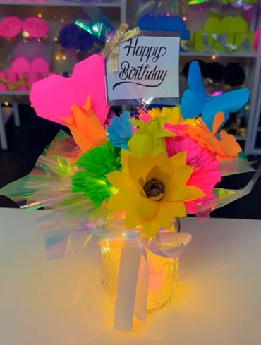 Now you can create your very own bouquet right in the store. Mix and match the flowers you like. You can also add a free heart or butterfly to put inside. Great for any occasion. Add lights for $5 more. Baby Roses do not come with this but you add those for additional fee.