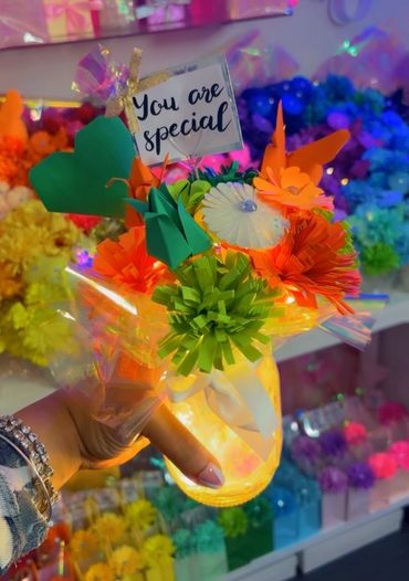 Build your own beautiful bouquet .4 different types of flowers to choose from. Pick any color you like. 12 assorted flowers comes in a vase or wrapped add tag , heart or butterfly. Add a light for $5 more